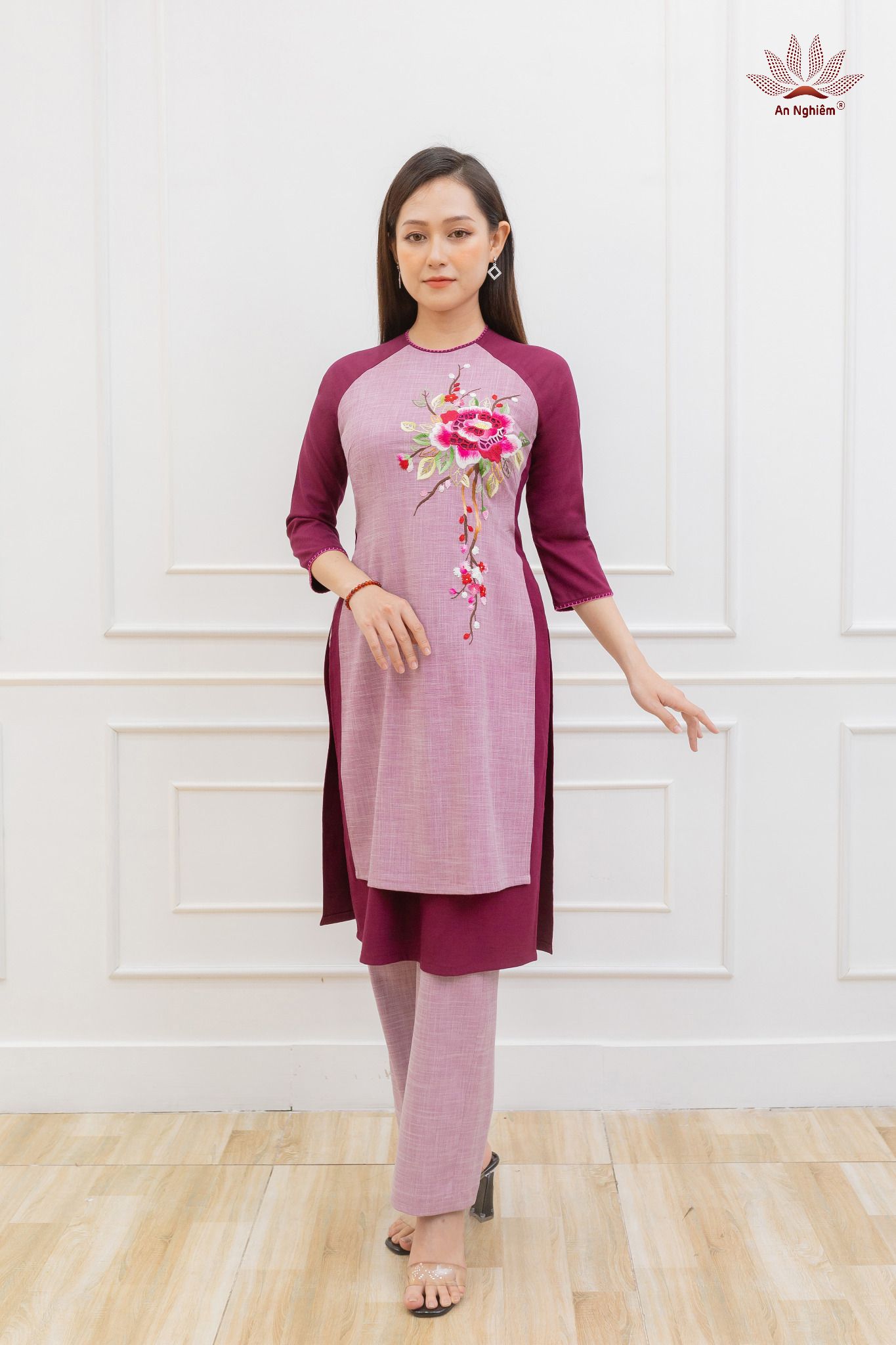 - Kiểu dáng : áo dài 2 tà với họa tiết thêu tay tỉ mỉ và khác biệt.