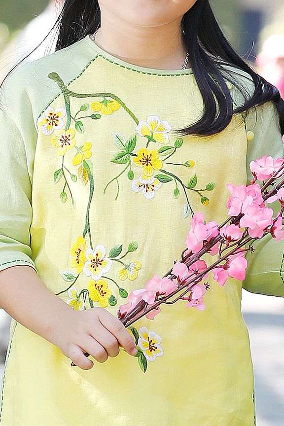 ÁO DÀI BÉ GÁI THÊU HOA MAI